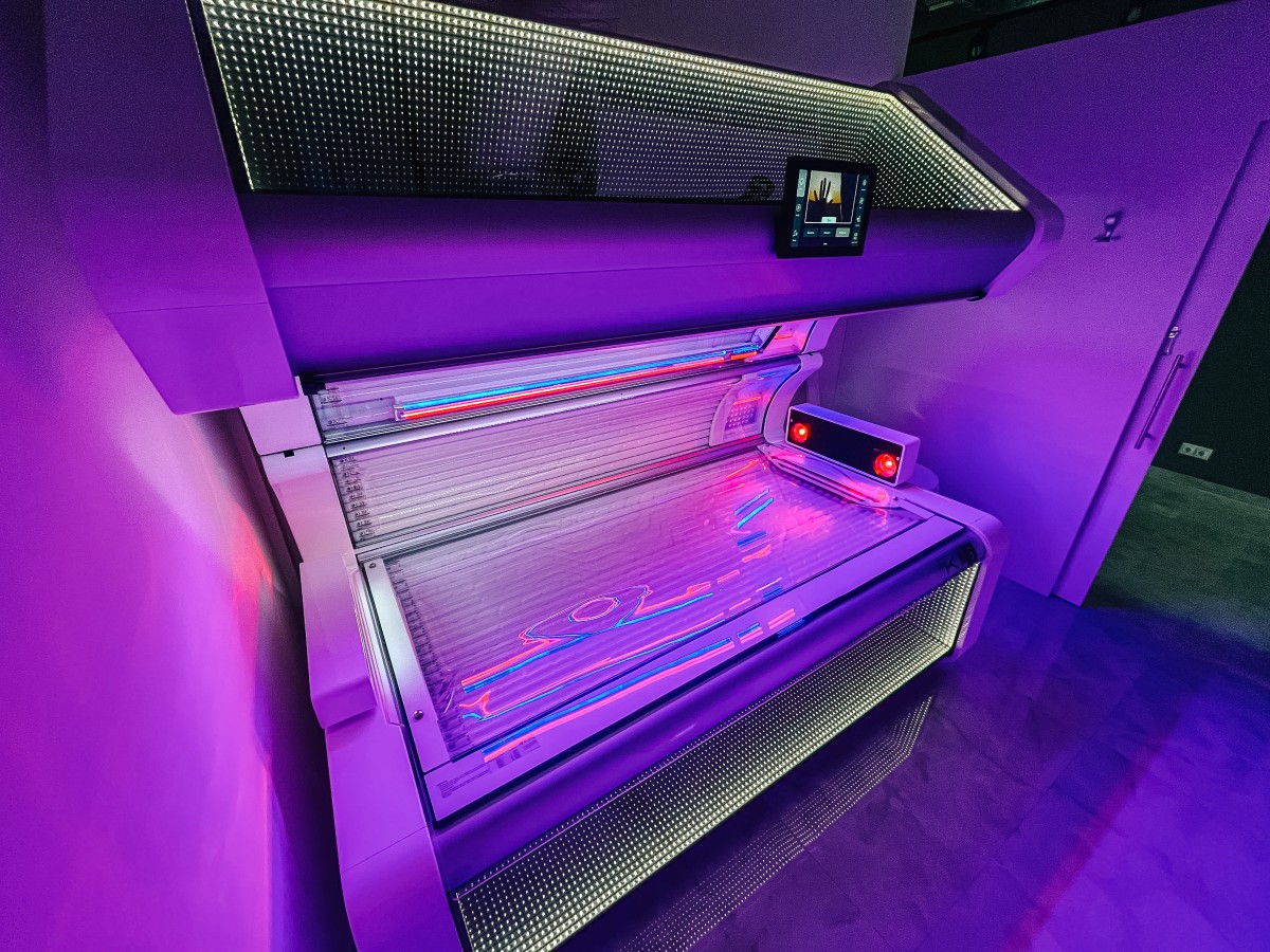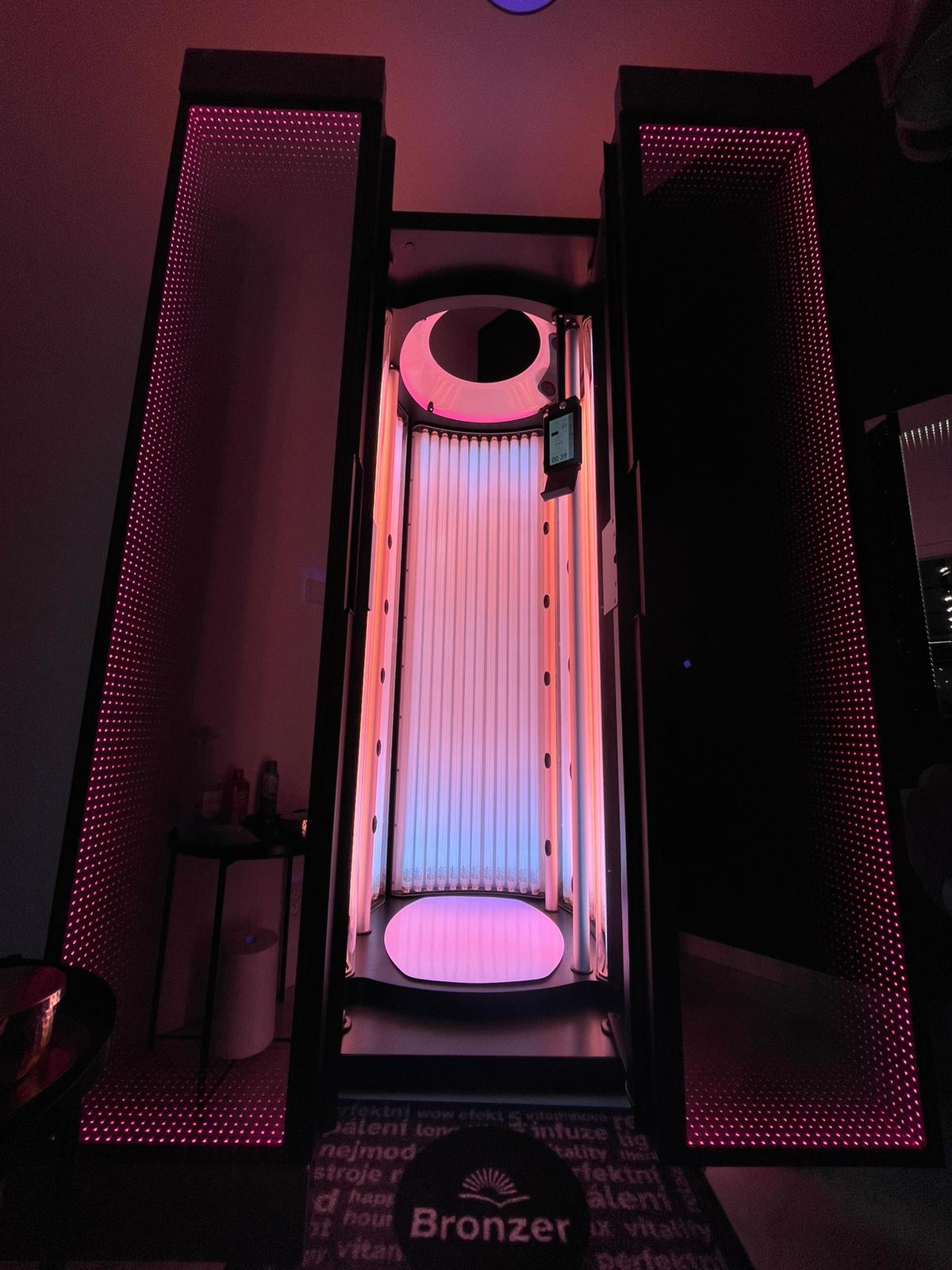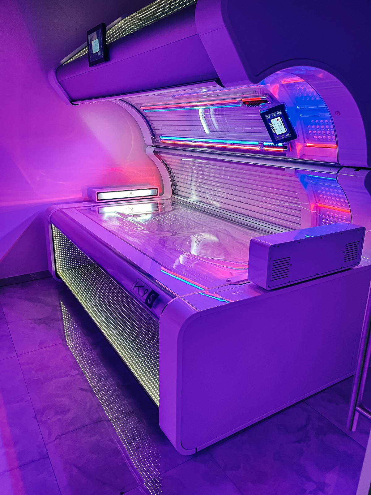 V kabince číslo 2 se nachází solárium s trubicemi navrženými pro tmavší, stabilní opálení, které proniká hlouběji do pokožky a vydrží výrazně déle. Kolagenové světlo podporuje regeneraci a pružnost pleti, zatímco inteligentní výbava stroje zajišťuje maximální komfort během opalování.